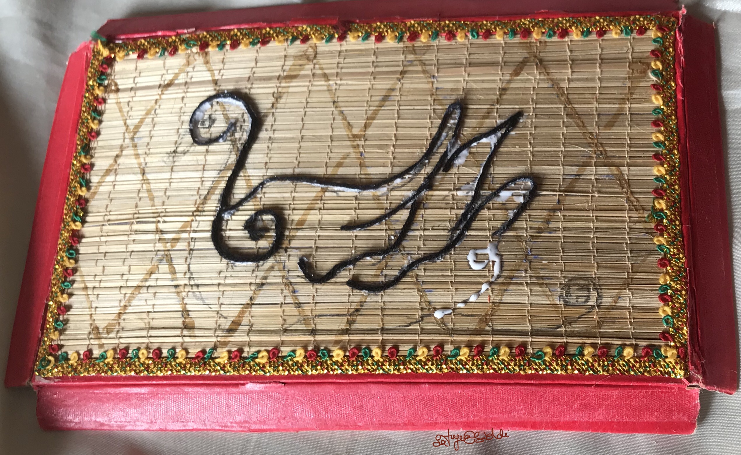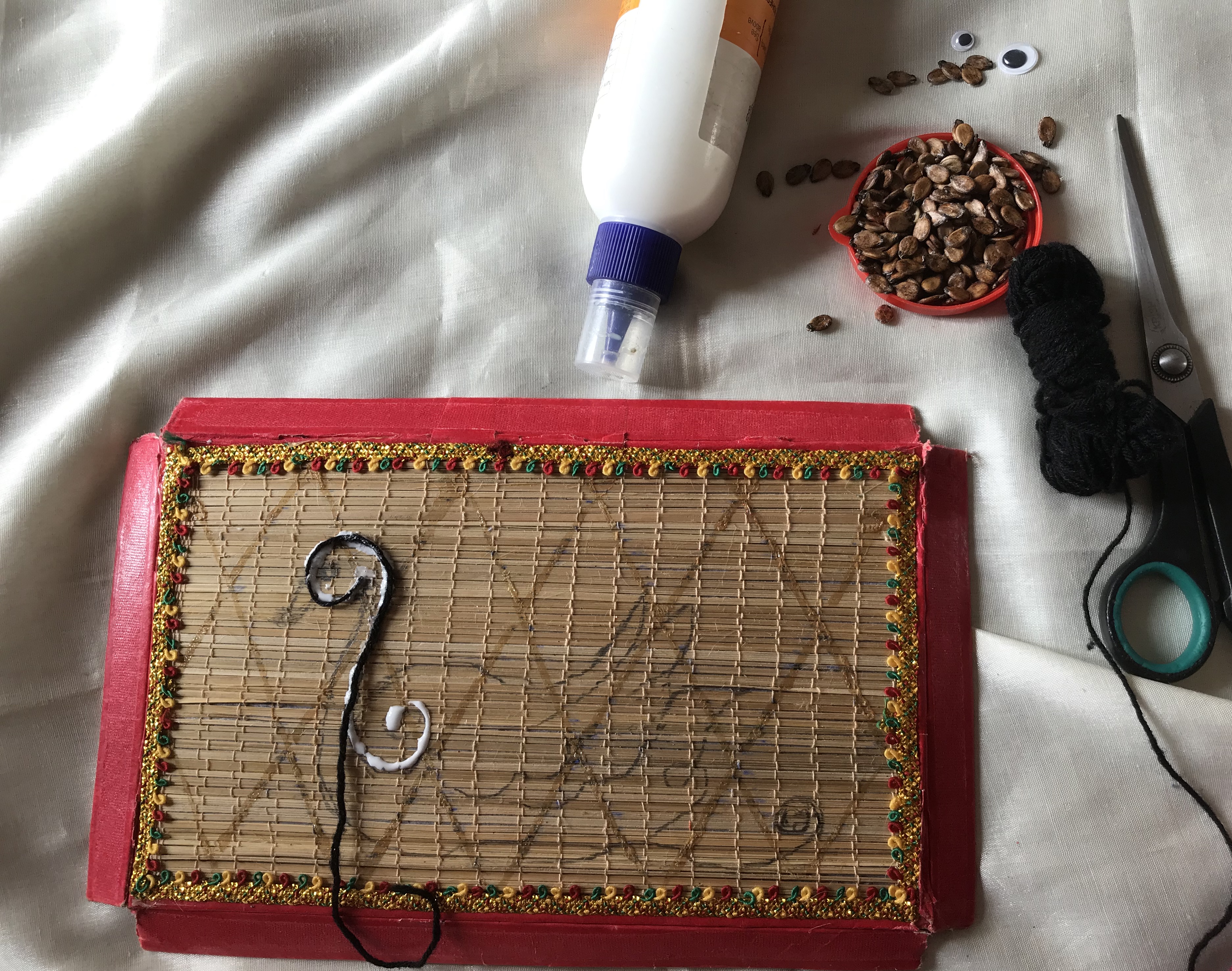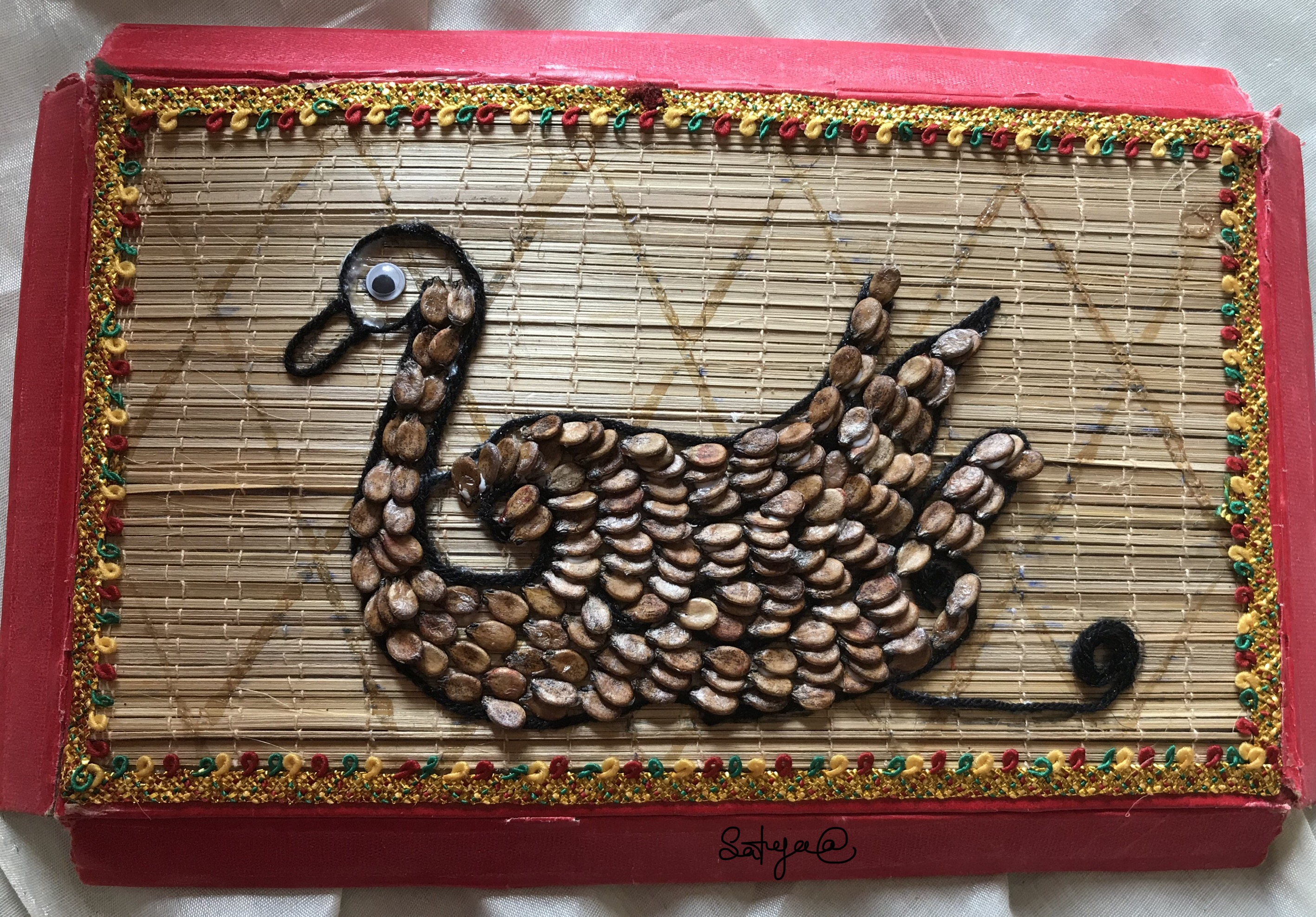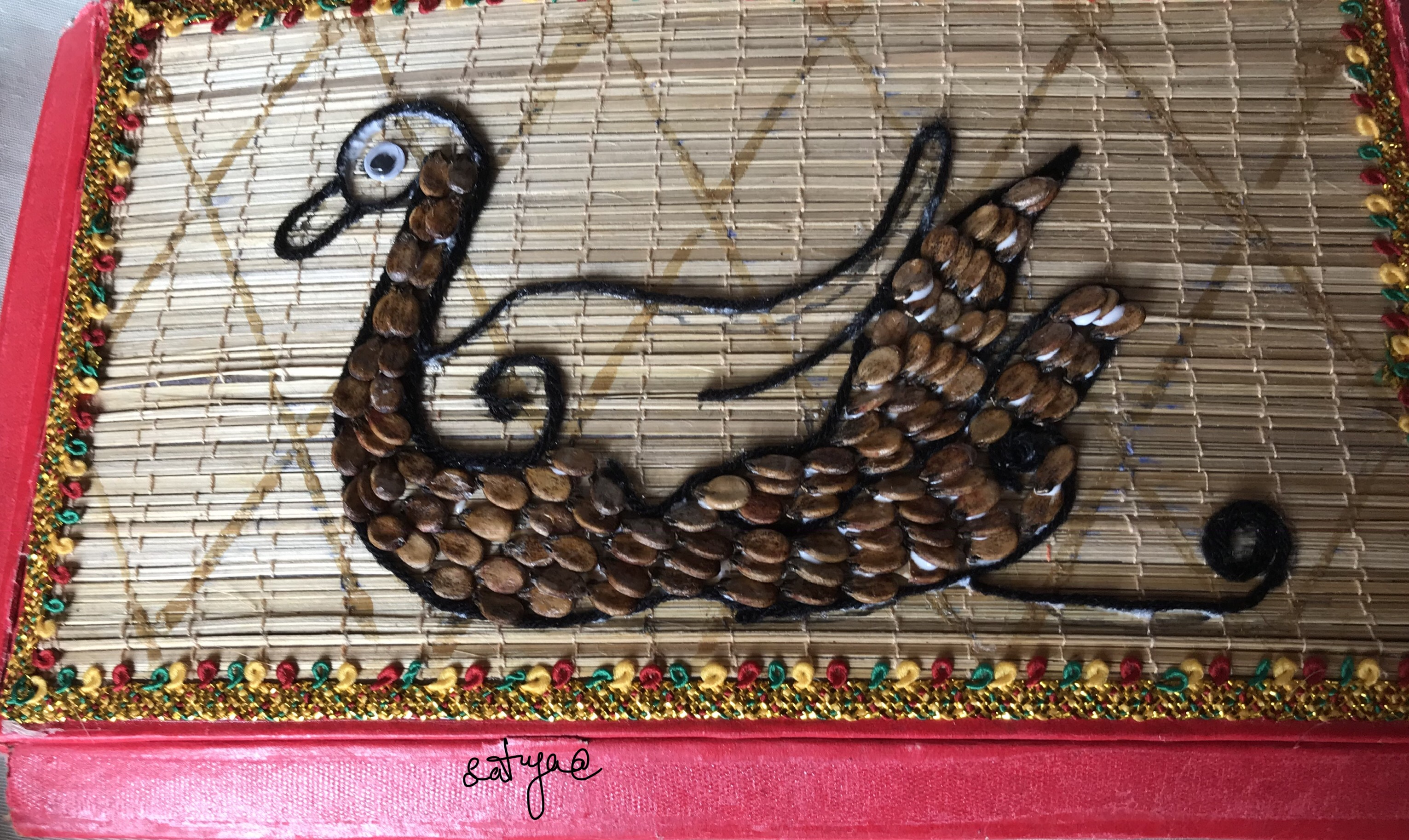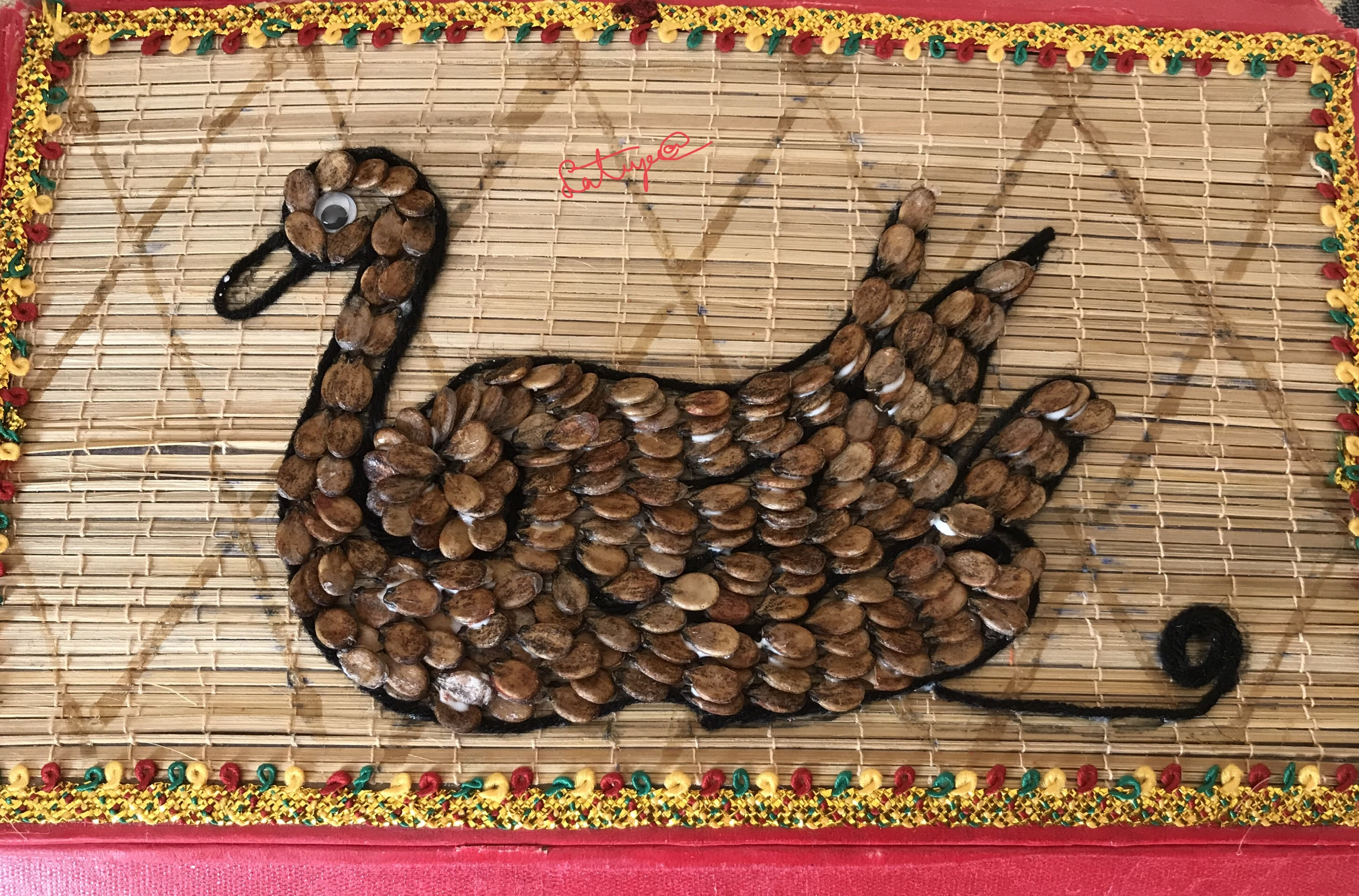 Materials required to make swan ,first u select any picture draw on the board with pencil,after you should stick black coloured woolen thread with the help of glue along the boarder line .you can stick watermelon seeds ,which are cleaned and stick eye