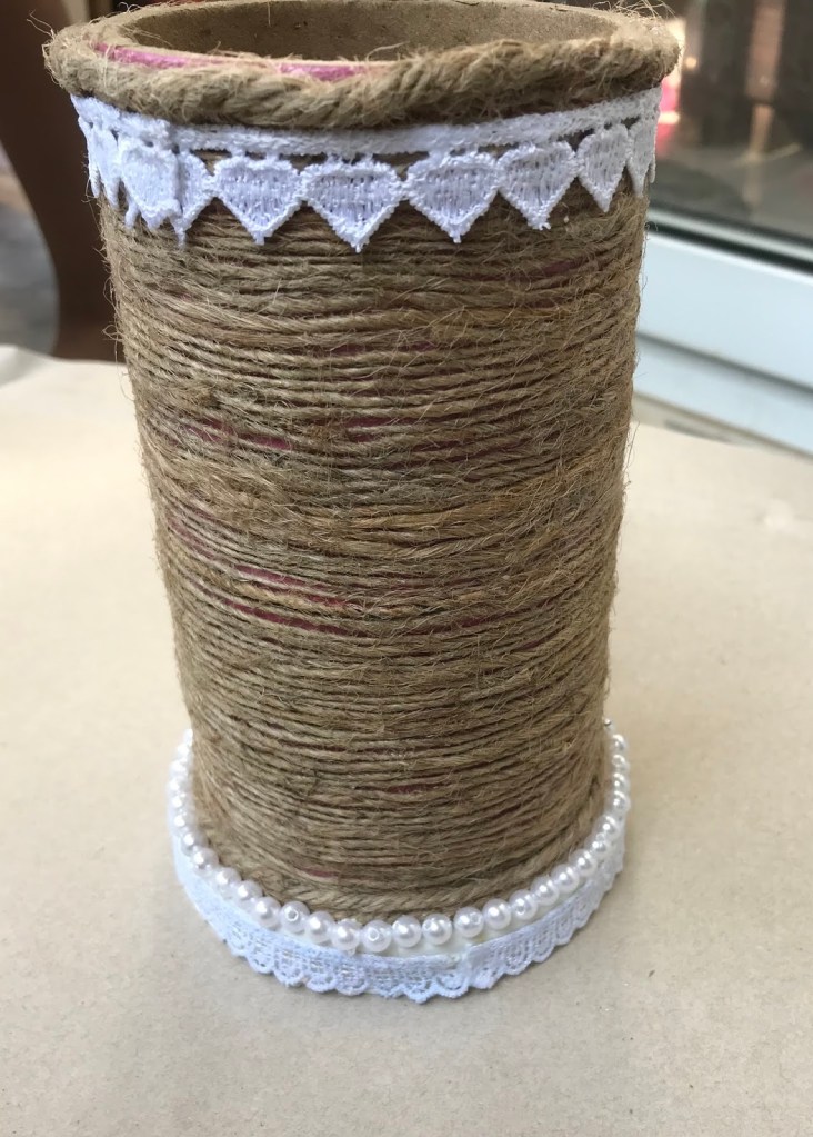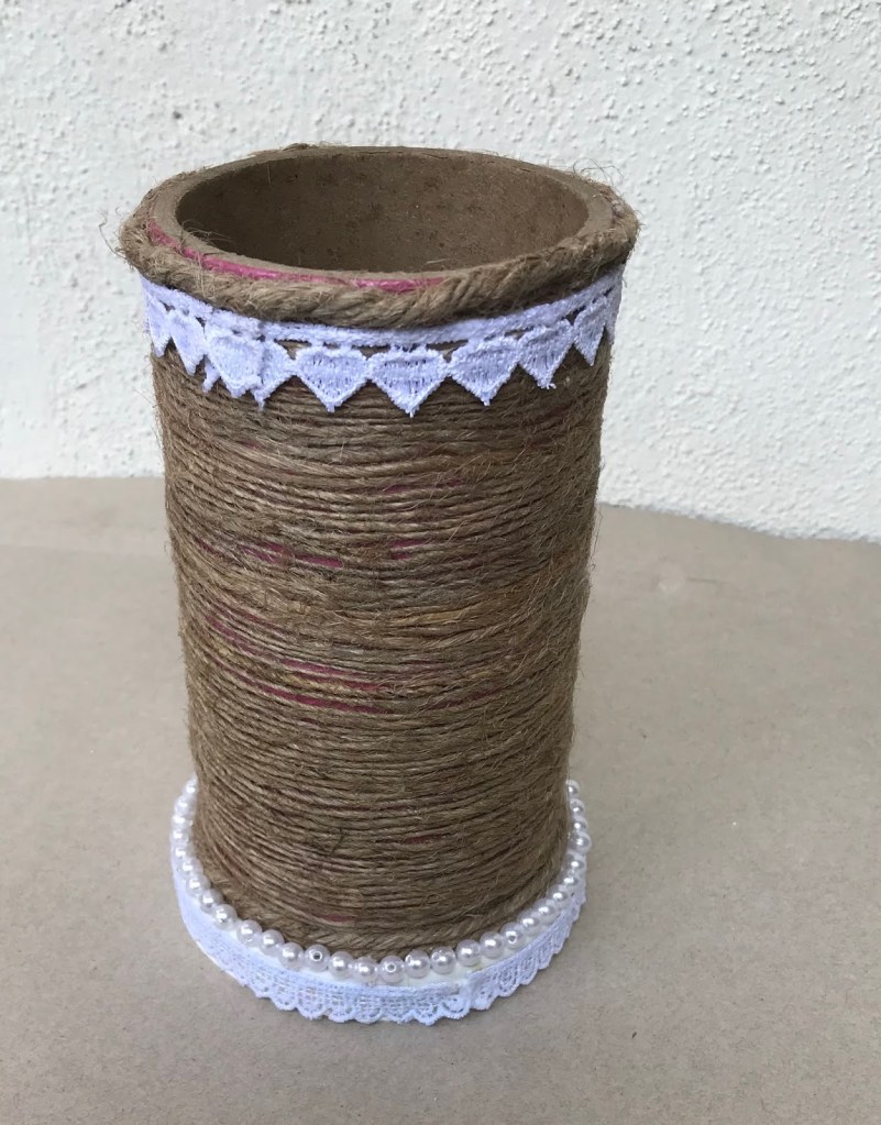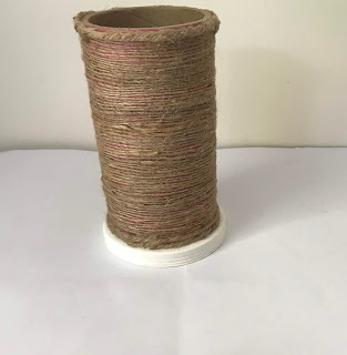 Flower Vase:-flowervase with waste materials,materials requried for this are jute thread,mirrors,lace,waste roll,plastic cap,glue.enjoy this holidays with making home decorate ideas.choose the waste rool cover with jute thread,attach plastic cap at the bottom.decorate with pearls ,lace mirrors