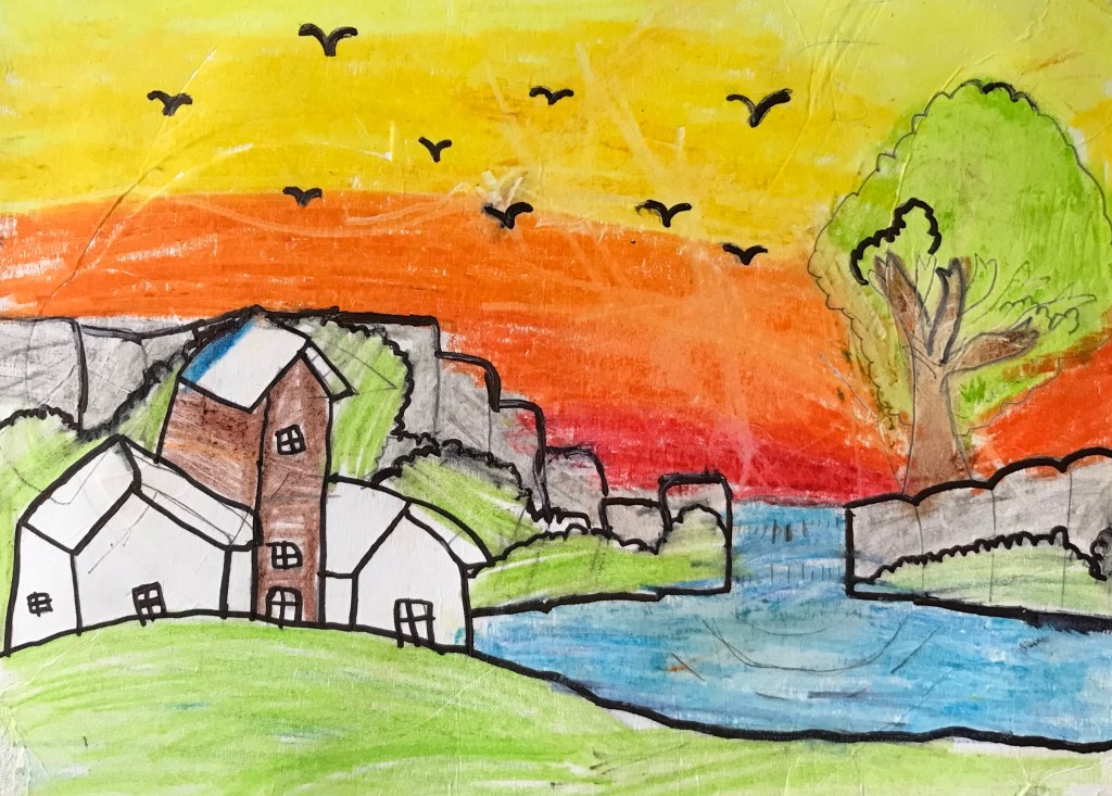 Different scenarios for kids these are very simple and easy to draw.Make an out line.Draw the basic shape of your objects ,colour it