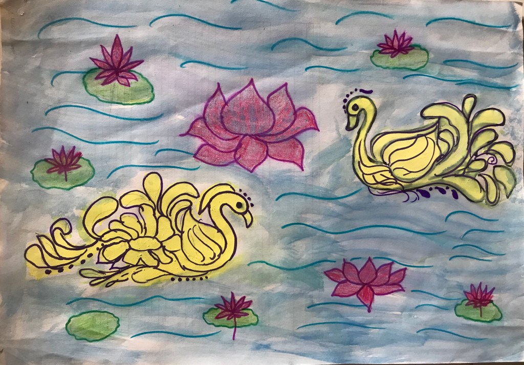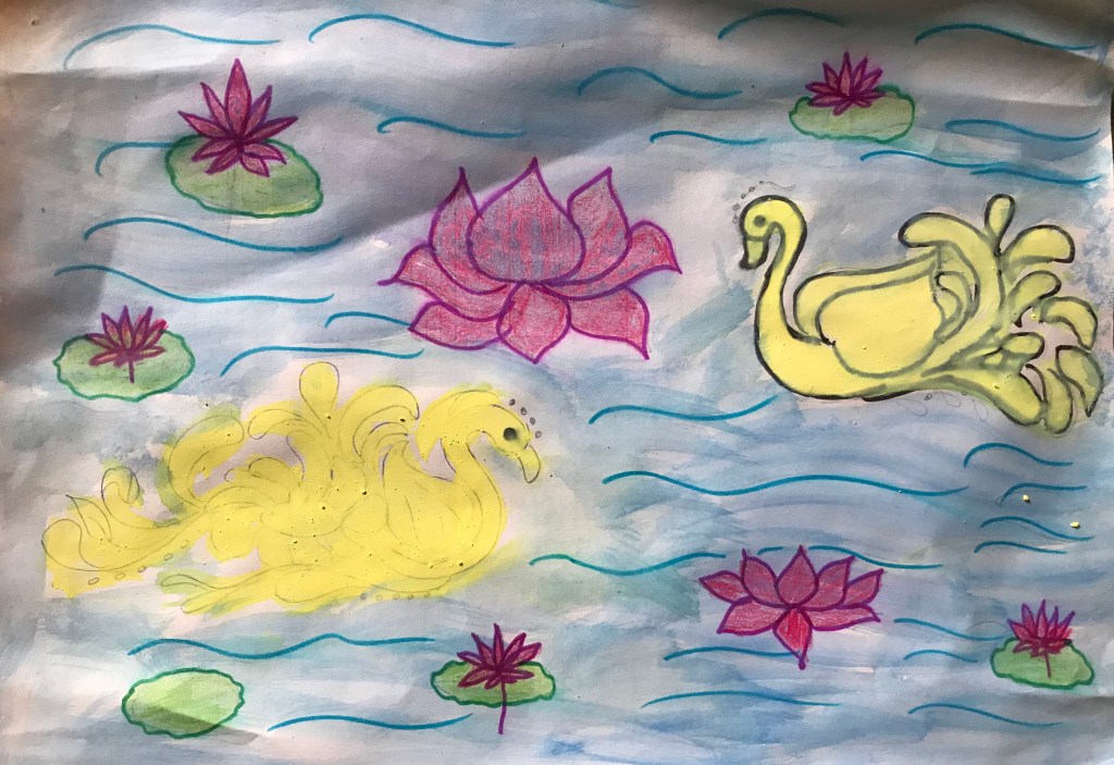 It is asimple drawing the swans swimming in the lotus pond,the pink coloured lotus looks beautiful ,the swans in light yellow coloured ,the lotus leaves in green and blue pond