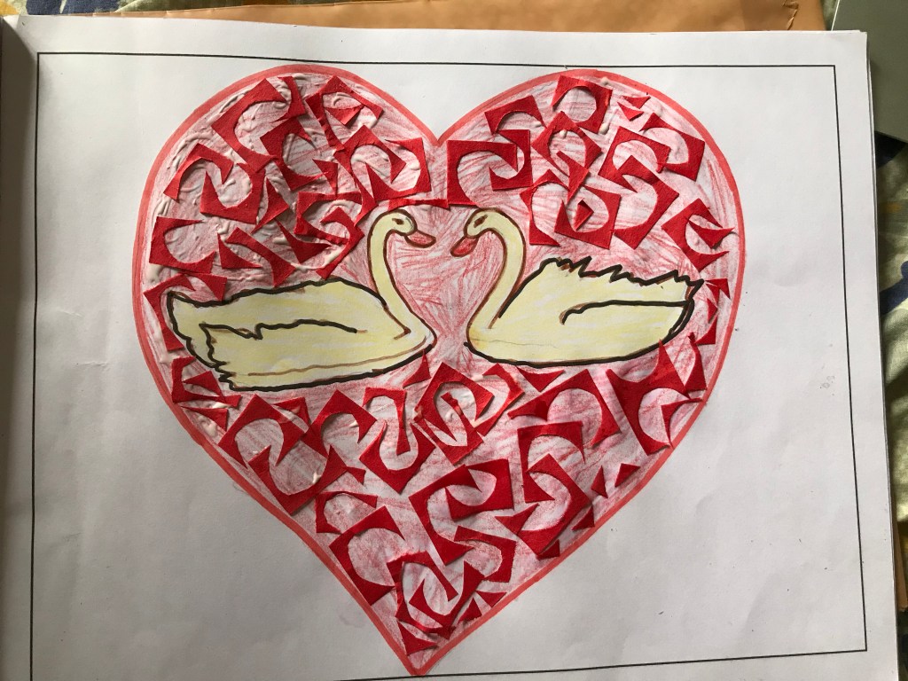 First you draw love birds and colour it here I preferred light yellow colour,after cut there’d coloured zigzag shapes siting them with glue ,after attach pink coloured heart shapes.Turn the page write your message
