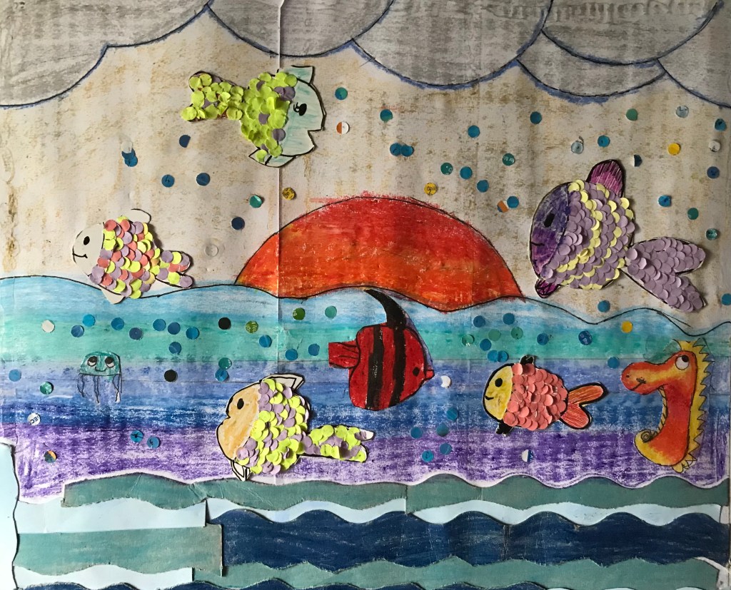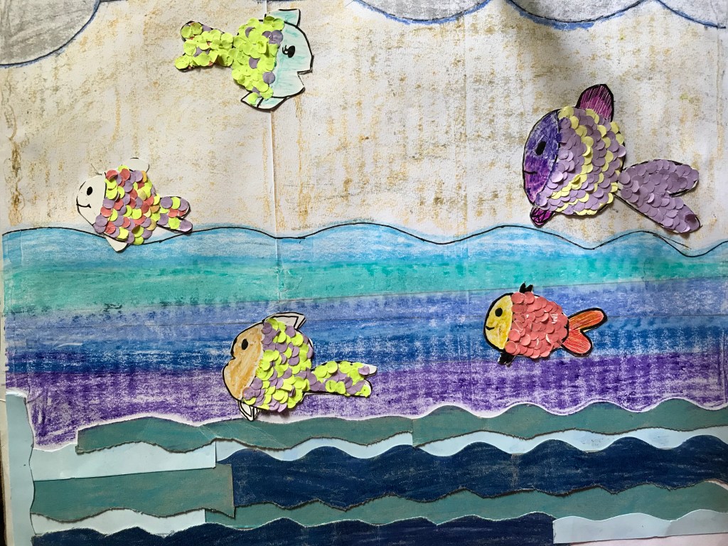 Step 3 : Third , Cut out the fishes and paste them on the drawing .