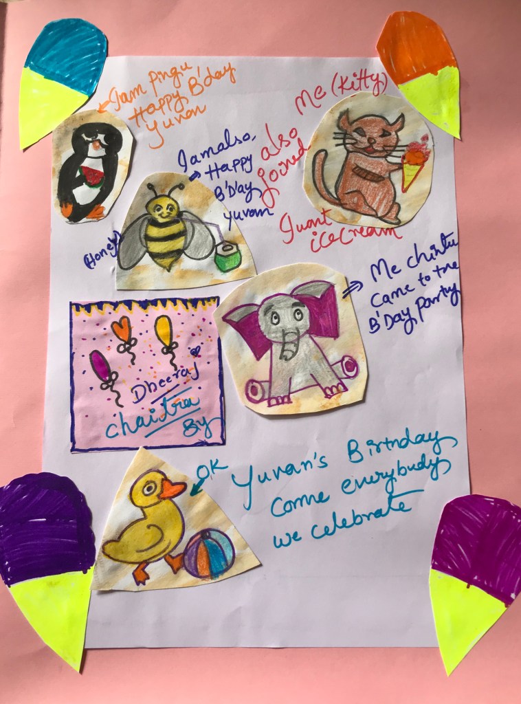 Step 3: Third , stick some pages of some drawings such as elephant , bee , cat and penguin. And write some thing about the the birthday .