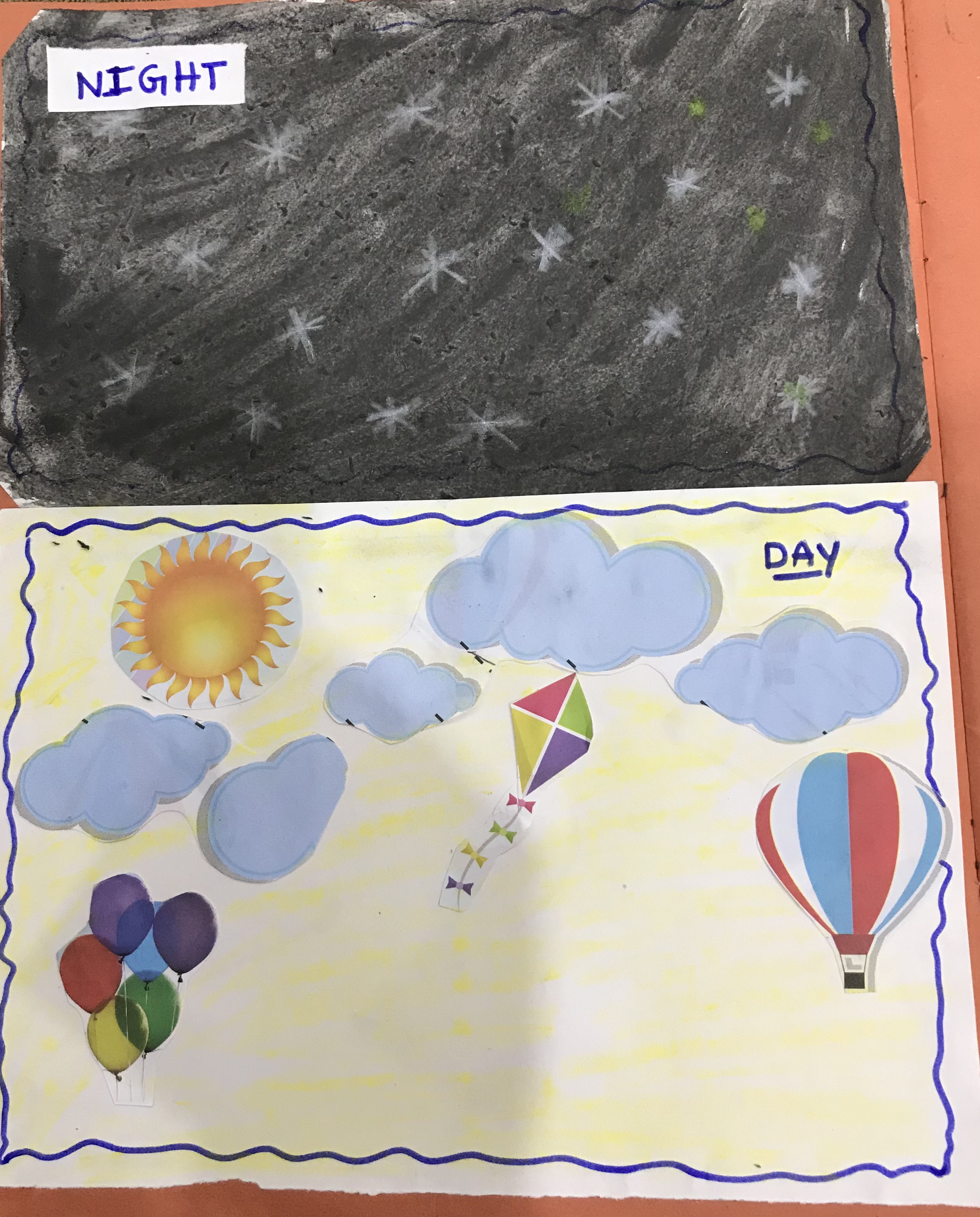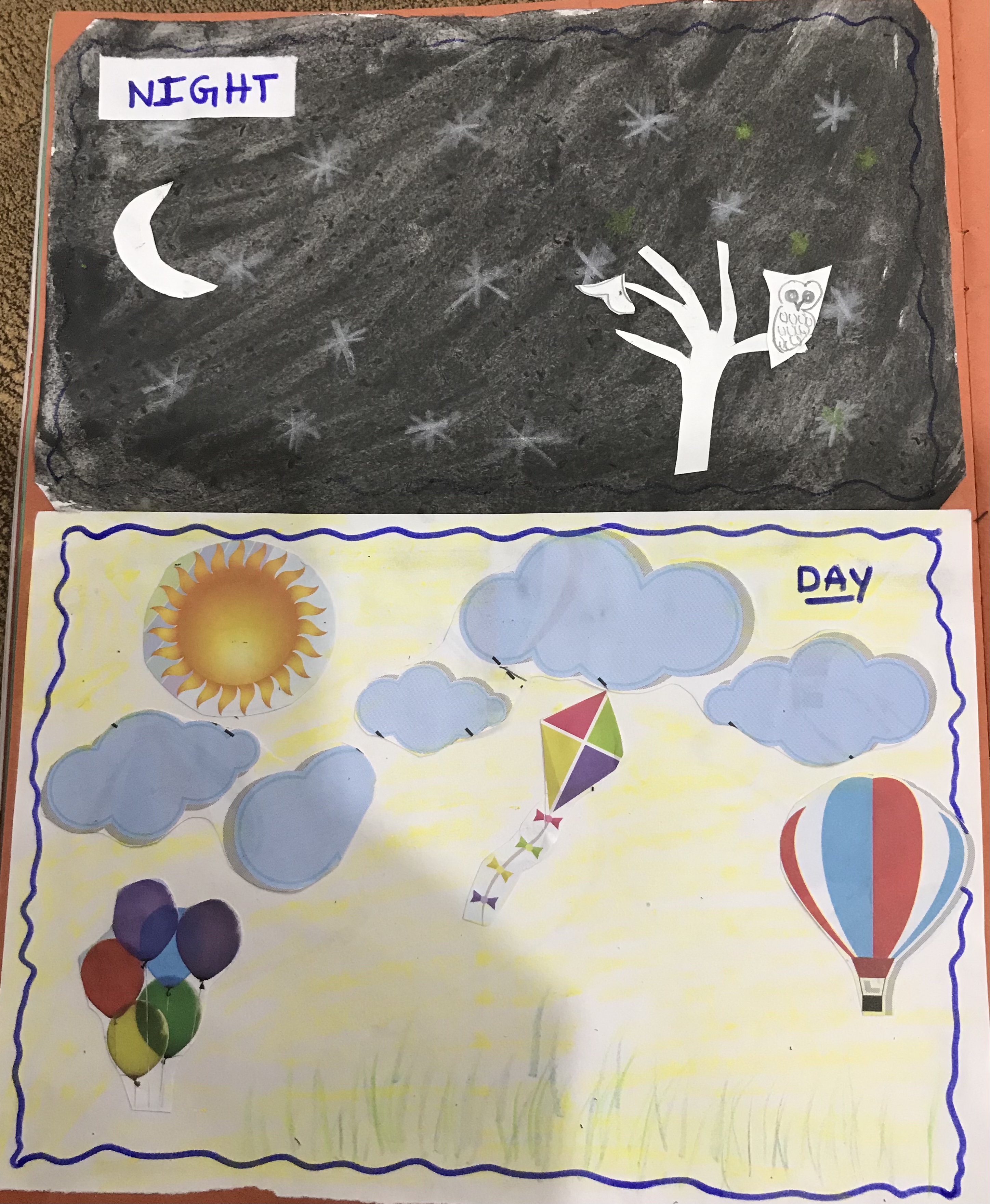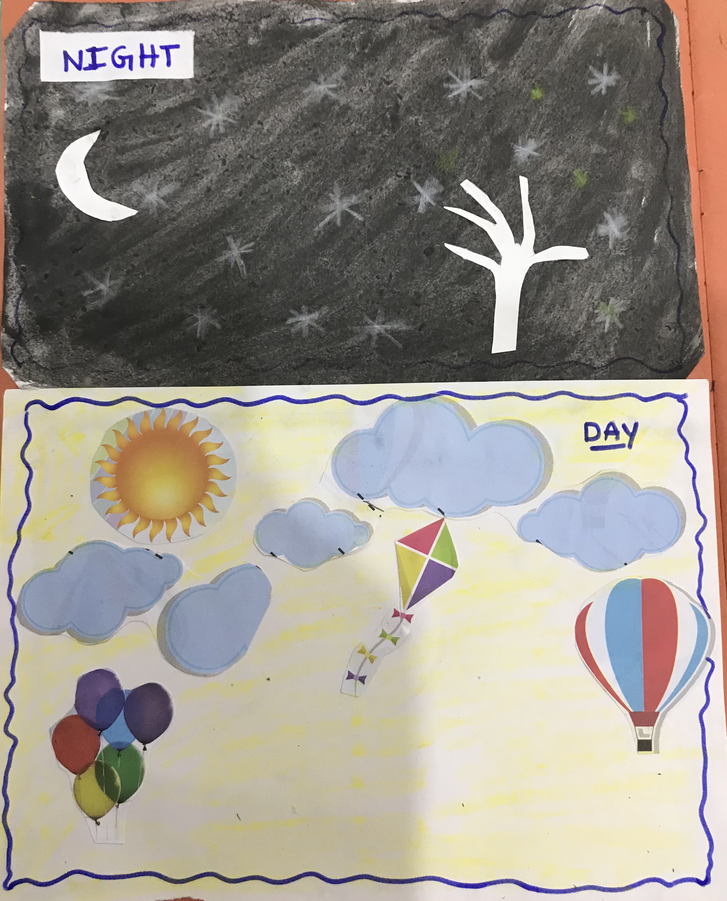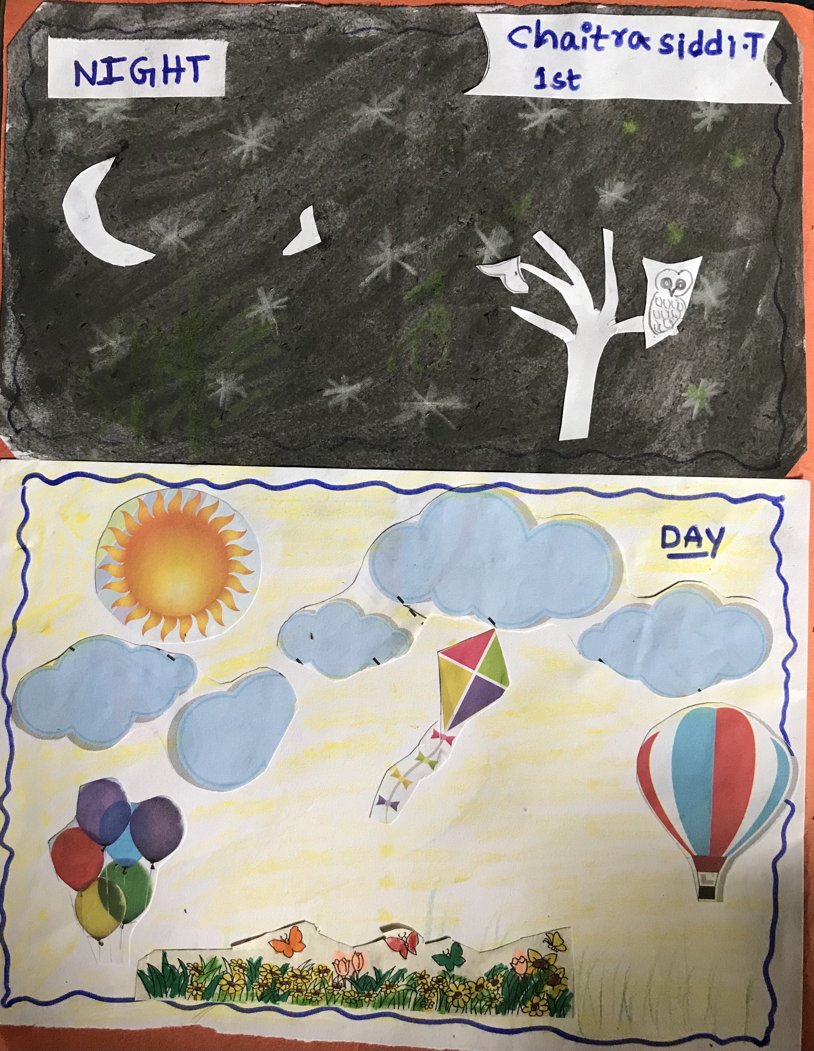 children enjoy to draw daytime and night time pictures ,which they observed in the nature ,To draw this I am choosing black for nighttime and yellow colour paper to represent daytime,mainly the things in day and night time sun,birds,clouds,stars stick some pictures as you like simple to make