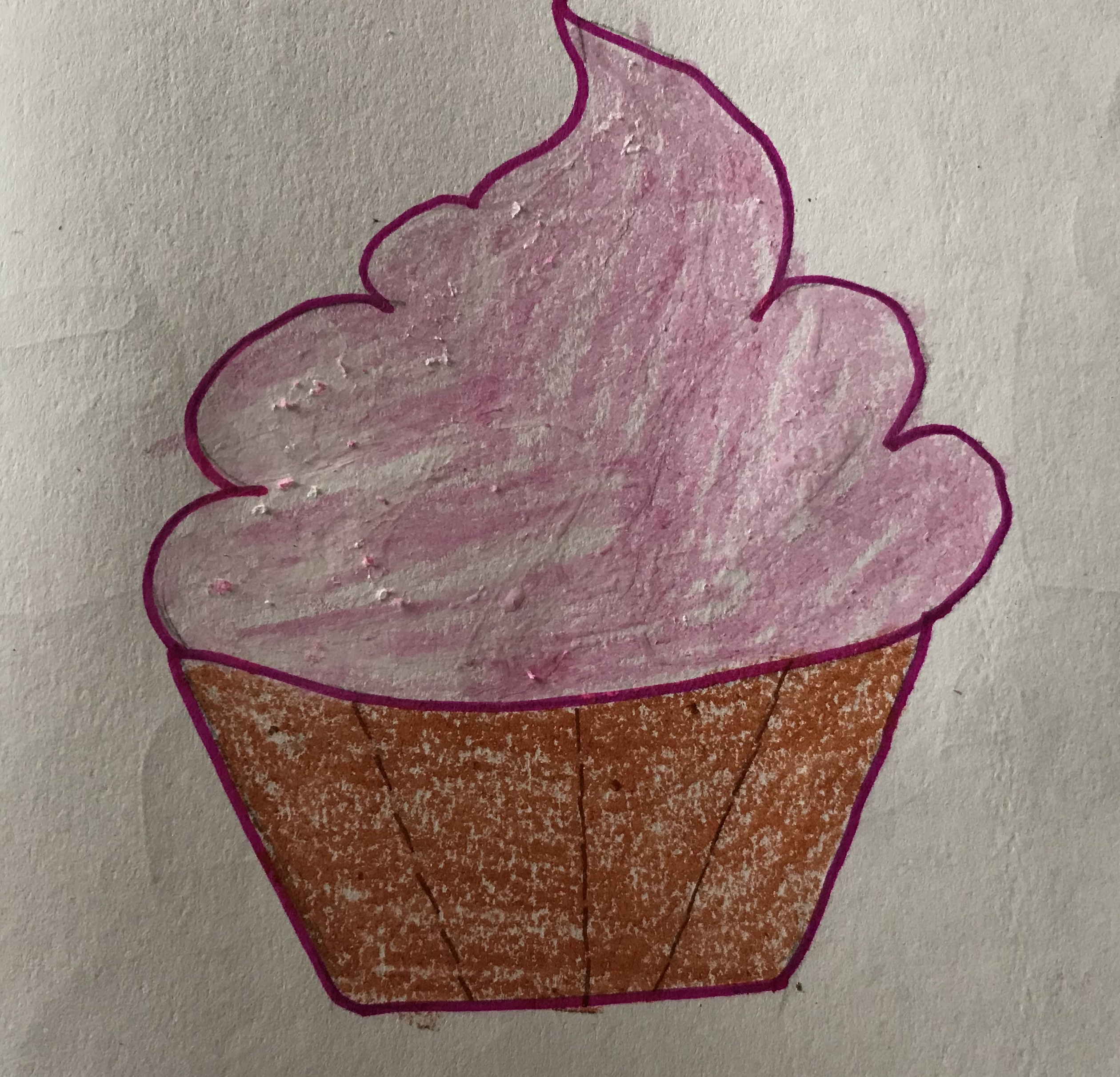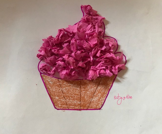 At the bottom you can draw a line and curves at both the ends connect the horizontal line with slant line as shown in picture 1.colour the bottom of the cupcake with brown or chocolate colour.Wrap the pink coloured paper like small balls attach them on top of the cupcake,see the sequence of steps in pictures down
