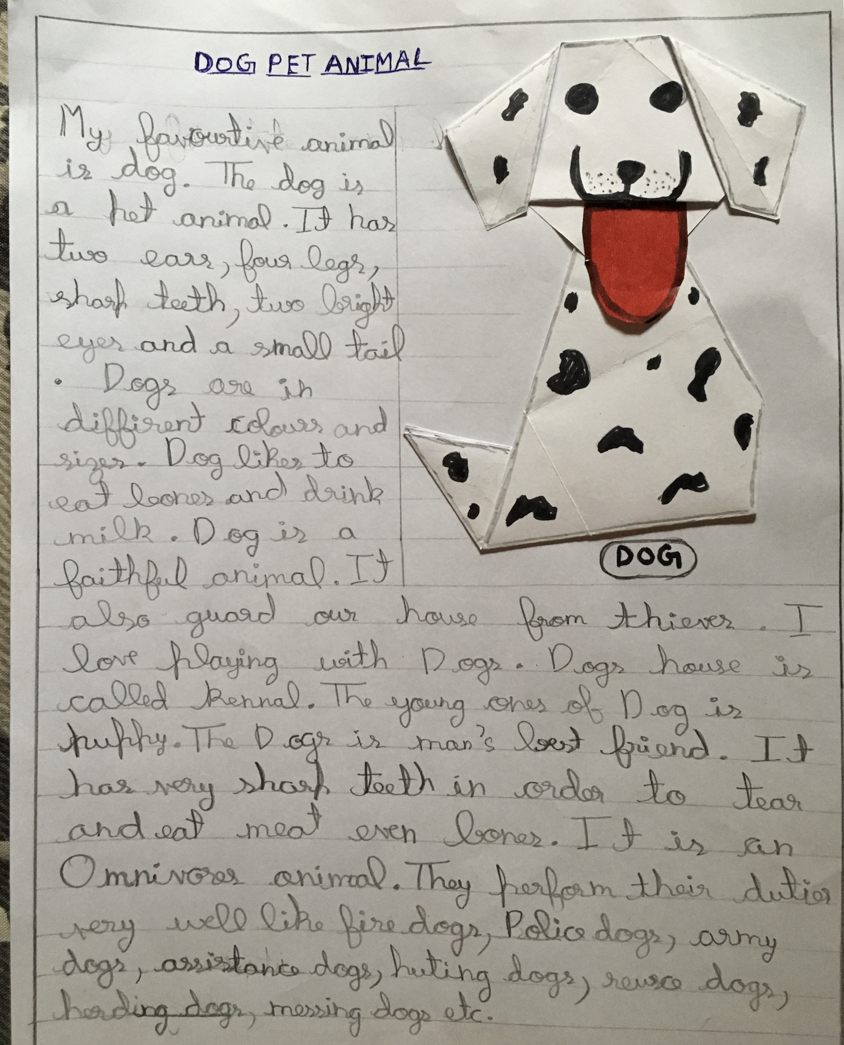 My favourite animal is dog 🐕 . The dog is a pet animal .It has two ears , four legs, sharp teeth, two bright eyes 👀 and a small tail.Dogs are in different colours and sizes.Dogs like to drink milk and eating bone 🦴.Dog is a faithful animal.It also guard the house 🏡 from thieves. I love playing with dogs 🐶.Dog house is called kennel