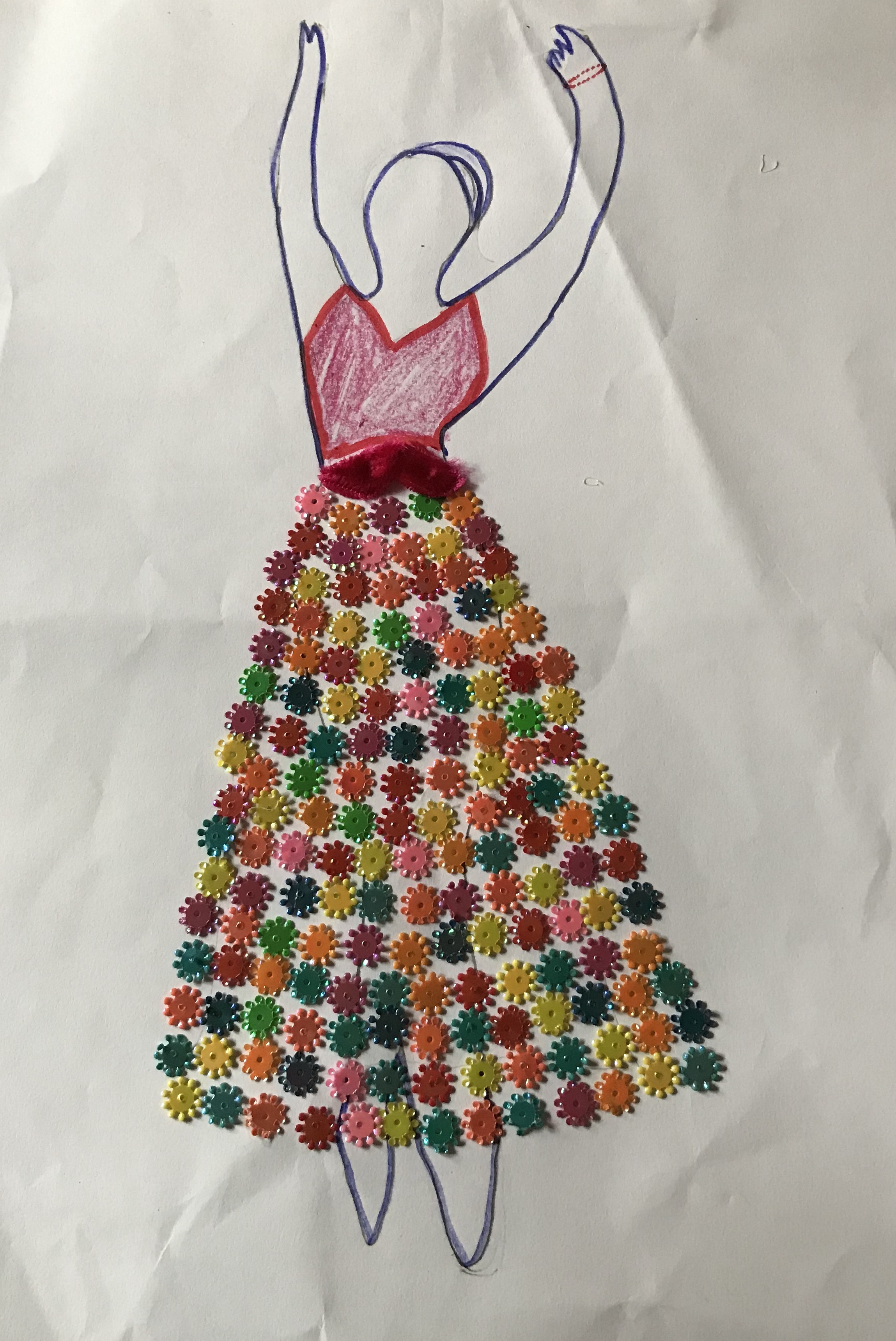 Step 4 : Third , draw the designs of the dress , skirt and hat of the girl .(you can do your own designs ) attach colour papers like dress